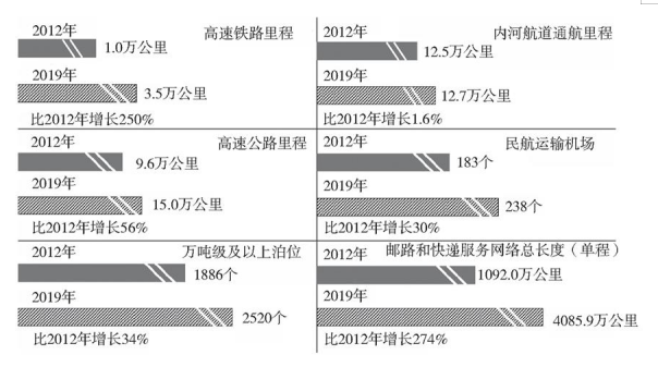 综合交通基础设施基本实现网络化。截至2019年底,全国铁路营业里程达到13.9万公里,其中高速铁路营业里程超过3.5万公里;全国公路里程达到501.3万公里,其中高速公路里程15万公里;拥有生产性码头泊位2.3万个,其中万吨级及以上泊位数量2520个;内河航道通航里程12.7万公里;民用航空颁证运输机场238个;全国油气长输管道总里程达到15.6万公里,互联互通程度明显加强;邮路和快递服务网络总长度(单程)4085.9万公里,实现乡乡设所、村村通邮。综合立体交通网络初步形成,有力支撑了经济社会持续快速健康发展。