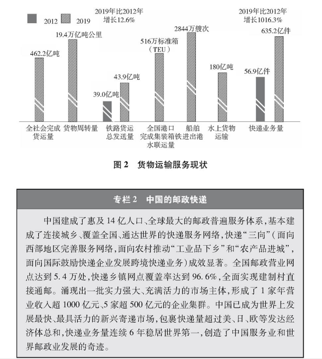 货物运输服务保障能力不断提升。中国是世界上运输最繁忙的国家。面对日益增长的货物运输需求,加快多式联运发展,创新公铁联运、空铁联运、铁水联运、江海联运、水水中转、滚装联运等高效运输组织模式,开展铁路运能提升、水运系统升级、公路货运治理等专项行动,货物运输结构持续优化,综合运输效率不断提高,物流成本逐步降低,交通运输环境污染明显减少,原油、成品油、天然气管道建设不断提速。铁路运量占社会运输总量比例不断提升,“公转铁”行动取得突出成效。港口货物吞吐量和集装箱吞吐量均居世界第一。快递业务量保持强劲增长态势,连续6年位居世界第一。运输服务能力大幅提升,推进物流降本增效取得积极成效,促进了物流业转型升级。
