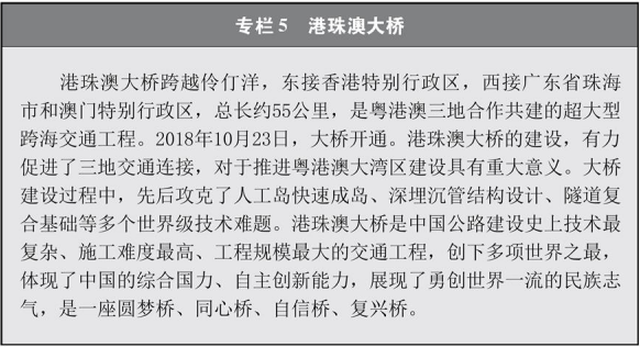 交通超级工程举世瞩目。高速铁路、高寒铁路、高原铁路、重载铁路技术达到世界领先水平,高原冻土、膨胀土、沙漠等特殊地质公路建设技术攻克世界级难题。离岸深水港建设关键技术、巨型河口航道整治技术、长河段航道系统治理技术以及大型机场工程建设技术世界领先。世界单条运营里程最长的京广高铁全线贯通,一次性建成里程最长的兰新高铁,世界首条高寒地区高铁哈大高铁开通运营,大秦重载铁路年运量世界第一,世界上海拔最高的青海果洛藏族自治州雪山一号隧道通车。川藏铁路雅安至林芝段开工建设。港珠澳大桥、西成高铁秦岭隧道群、洋山港集装箱码头、青岛港全自动化集装箱码头、长江口深水航道治理等系列重大工程举世瞩目。中国在建和在役公路桥梁、隧道总规模世界第一,世界主跨径前十位的斜拉桥、悬索桥、跨海大桥,中国分别有7座、6座、6座,世界最高的10座大桥中有8座在中国。