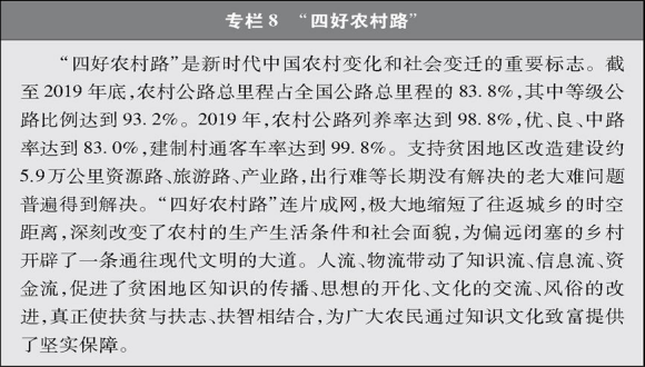 农村公路助力广大农民奔小康。农村公路发展,重点在“建”,目标在“通”。2012年至2019年,中国新改建农村公路208.6万公里(其中贫困地区约110万公里),农村公路总里程达到420.1万公里,贫困地区新增5.1万个建制村通硬化路。2016年至2019年,贫困地区建设约9.6万公里通较大人口规模自然村的硬化路,建设45.8万公里农村公路安全生命防护工程,农村公路运行安全条件全面改善。出台《农村公路建设管理办法》《农村公路建设质量管理办法》《农村公路养护管理办法》,加快推进相关技术标准和规范制修订工作。出台《关于深化农村公路管理养护体制改革的意见》及相关配套制度,推进农村公路管理养护体制改革,建立健全农村公路管理养护长效机制。2012年至2019年,通行客车的建制村新增5.4万个。加快建设县乡村三级农村物流节点体系建设,推进农村物流发展,2019年农村地区收投快件超150亿件,工业品下乡、农产品出村、快递服务入户等运输服务能力不断提升。