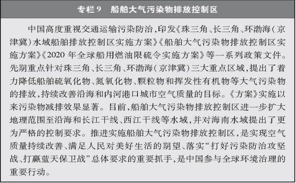 强化大气与水污染防治。坚决打好交通运输领域污染防治攻坚战,用最严格的制度、最严密的法治治理环境污染。在沿海和长江干线等水域设立船舶大气污染物排放控制区,按照国际公约要求对进入中国水域的国际航行船舶实施船用燃油硫含量限制措施,推动船舶使用清洁能源和加装尾气污染治理装备,建立船用低硫燃油供应保障和联合监管机制。执行船舶水污染物排放控制国家强制性标准,推动港口船舶含油污水、化学品洗舱水、生活污水和垃圾等接收处置设施建设,开展港口粉尘污染控制。在全国沿海实施“碧海行动”(注6)计划,打捞存在污染环境风险和影响海上交通运输安全的沉船沉物。加快老旧和高能耗、高排放营运车辆、施工机械治理和淘汰更新,推进实施机动车排放检测与强制维护制度(I/M制度)。中央财政采取“以奖代补”方式支持京津冀及周边地区、汾渭平原淘汰国Ⅲ及以下排放标准营运柴油货车。全面开展运输结构调整三年行动,2012年至2019年全国机动车污染物排放量下降65.2%。