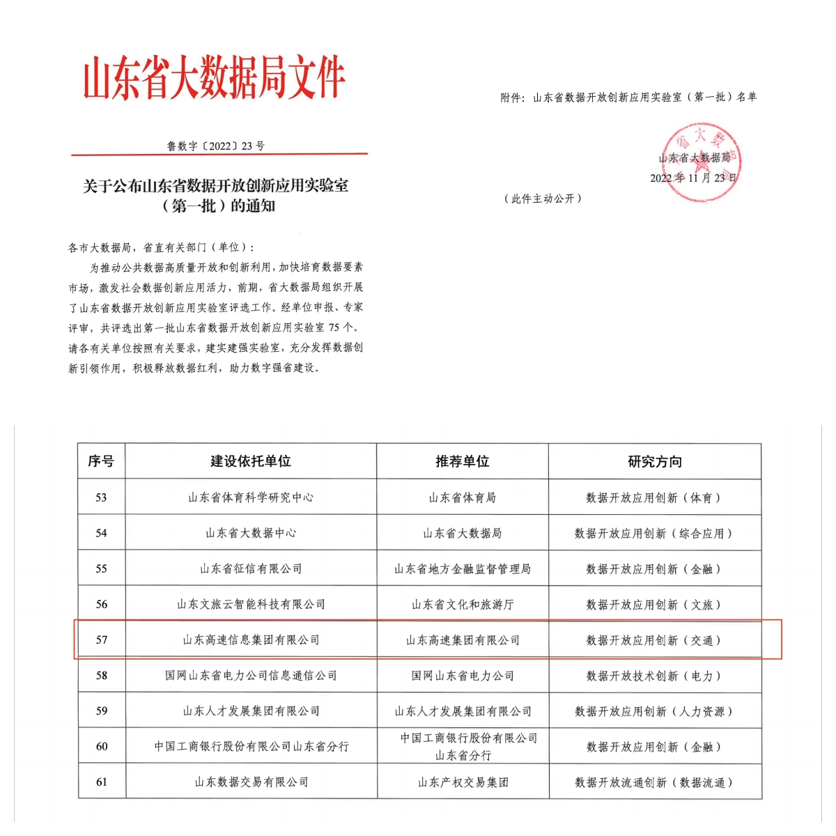 近日,山东省大数据局公布了“山东省数据开放创新应用实验室(第一批)”名单,由山东高速集团推荐、山东高速信息集团作为建设依托单位申报的“数据开放应用创新(交通)实验室”成功入选,这是山东高速集团在大数据领域首次获此殊荣。