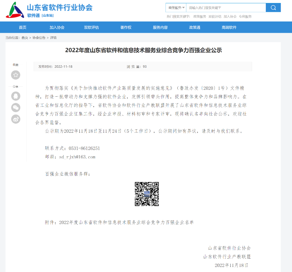 近日,2022年度山东省软件和信息技术服务业综合竞争力百强企业名单公布,山东高速信息集团有限公司、山东旗帜信息有限公司凭借在企业规模效益、研发创新能力、社会责任贡献等方面优秀表现成功入选百强企业。