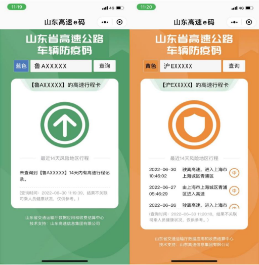 “高速公路车辆防疫码”整合了全国高速公路通行数据和疫情防控数据资源,利用车辆在高速公路收费站出入口记录与疫情风险区域进行交叉对比,形成车辆14天内的风险地区行程。当车辆通过高速公路收费站,14天内未进入过疫情地区,界面显示为绿色;当车辆通过高速公路收费站,14天内驶入或驶出疫区,界面显示为橙色。