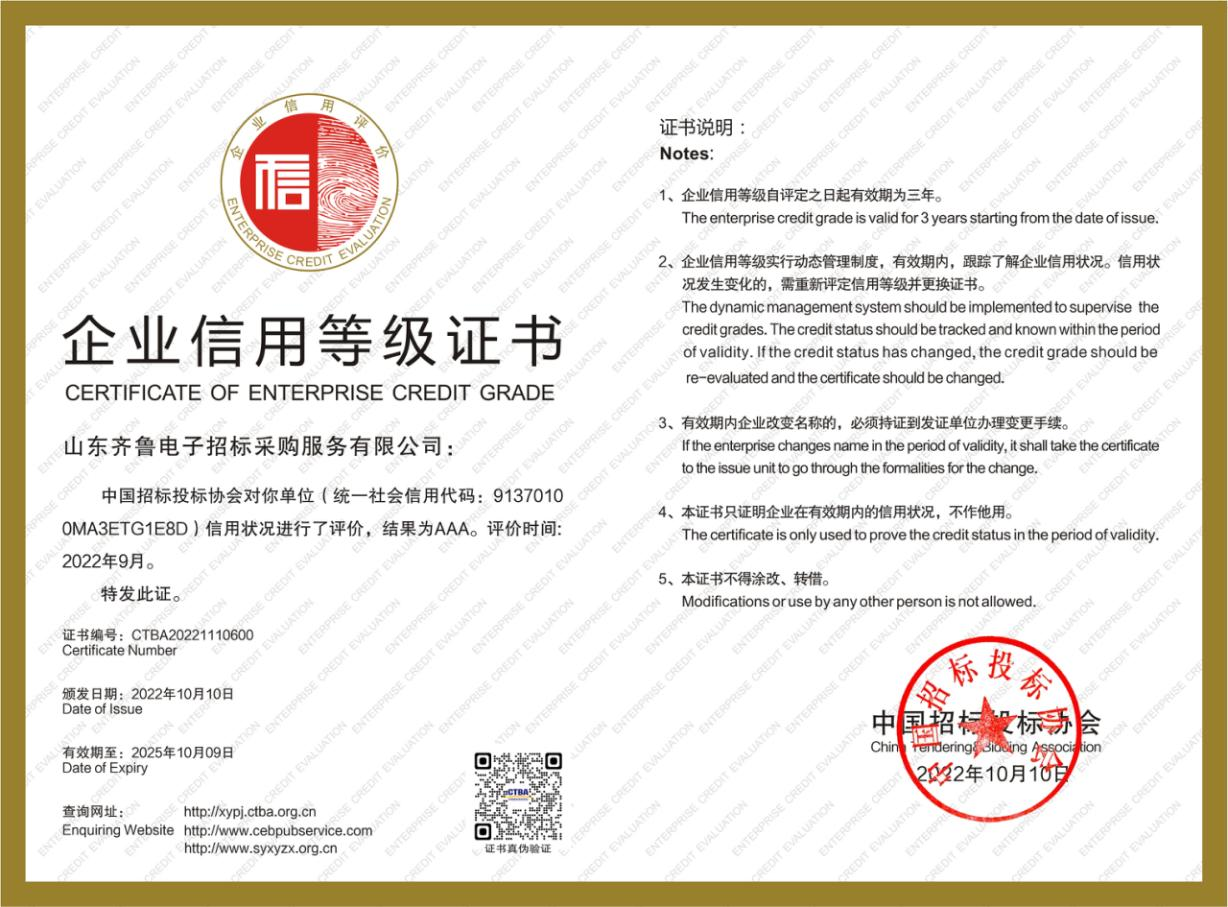 近日,山东高速信息集团旗下山东齐鲁电子招标采购服务有限公司被中国招标投标协会认定为AAA级信用招标代理机构。