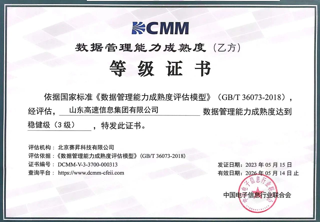 近日,中国电子信息行业联合会公布获得数据管理能力成熟度等级证书的单位名单,山东高速信息集团通过DCMM稳健级(3级)认证,标志着其在为客户提供优质数据产品及实施数据治理服务的能力方面获得行业认可。